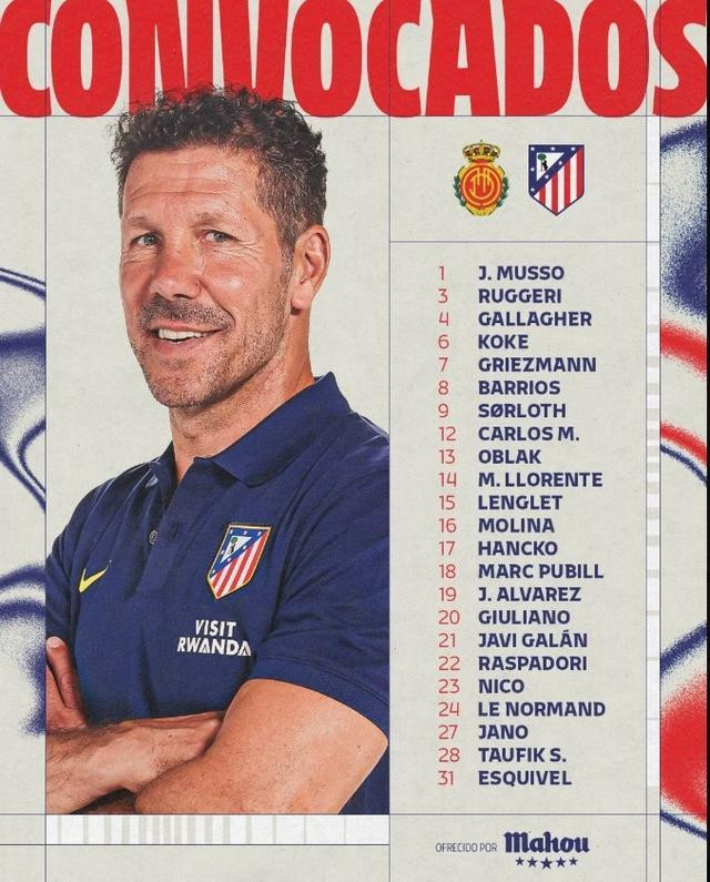 9月21日讯 西甲第5轮比赛,马竞将前往客场挑战马洛卡。目前,床单军团已经公布了本场比赛大名单,阿尔瓦雷斯复出,格列兹曼、加拉格尔在列。